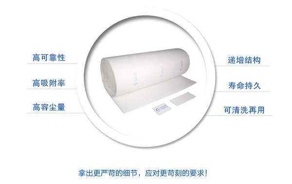 中效過濾棉有很多種類,有中效細纖過濾棉、頂篷過濾棉,中效針刺過濾棉,中效燙面過濾棉,中效無紡布過濾棉,熔噴過濾棉等,主要用于過濾小于5μm、大于1μm的塵埃粒子,一般用于粗效過濾之后的二級或終極過濾,也多用于中效板式過濾器以及中效袋式過濾器的濾料。 高效過濾棉:主要用于制造高效空氣過濾器,可過濾0.5μm以下的顆粒物,主要應用于醫院或者實驗室等過濾要求特別高的環境中。這種空氣過濾棉的出風面比較密集。利用了多層加密技術,這種結構使濾料保持很好的過濾效率和較高的容塵量,可根據塵埃大小阻擋在不同密度的層次,更有效的容納較多的塵埃。